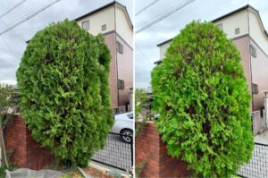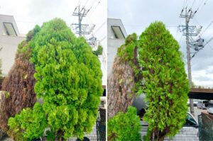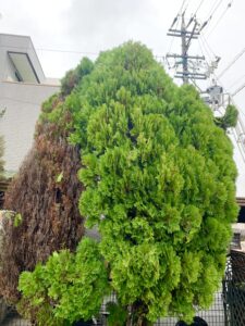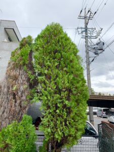 立派なコノテガシワを2本剪定で、大きい方は5m弱の高さがあります。
